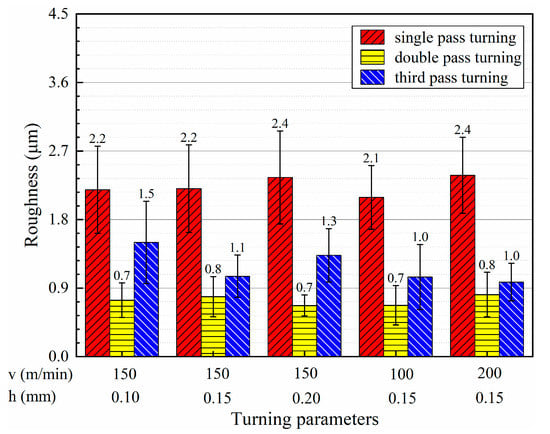 As shown in Figure 6, the chip tumors attached to the machined surfaces after single-pass turning resulted in greater roughness. The number of chip tumors on the surface of double and triple-pass turning decreased. However, the roughness after triple-pass turning was greater than that after double-pass turning. The hardening caused by the double-pass turning led to deeper scratches after the triple-pass turning, which may cause the roughness to be larger after the third pass turning. Changes of microstructure and properties of near-surface layers in previous pass turning may have influenced the surface roughness of latter pass turning.