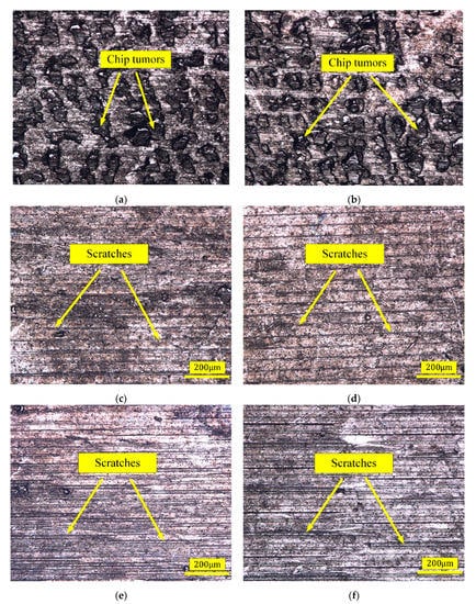 The microscopic images of the surface after multi-pass turning are presented in Figure 6. As shown in Figure 6a,b chip tumors were observed on the surface of single-pass turning, which led to rough machined surfaces. Figure 6c–f show the machined surfaces of double and triple-pass turning. Scratches left by the turning and fine chip grains could be clearly observed.