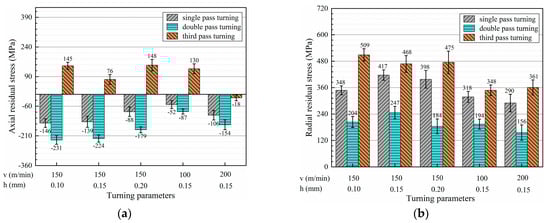 In both the axial and radial directions, the residual stresses were a minimum after double-pass turning, while the surface residual stresses were a maximum after triple-pass turning. Compared with single-pass turning, the surface residual stresses in the axial and radial directions decreased by 69 MPa and 157 MPa on average for the double-pass turning. The residual stresses in triple-pass turning increased by an average of 202 MPa in the axial direction and an average of 78 MPa in the radial direction compared with single-pass turning. Comparing double-pass turning of T6 with single-pass turning of T3, triple-pass turning of T11 with double-pass turning of T7, the residual stress of double-pass turning was relatively small at the same turning speed and total cutting depth.