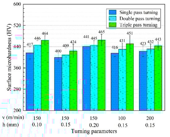 The turning process may cause changes in microhardness due to plastic deformation and thermal effects. The surface microhardness and standard deviation after multi-pass turning are illustrated in Figure 8. The surface microhardness increased and then decreased with the turning speed for double and triple-pass turning, while the surface microhardness after single-pass turning presented an increase with the increase in speed. The surface microhardness after single-, double-, and triple-pass turning decreased and then went up with the turning depth. At the same turning parameters, the surface microhardness rose as the number of turning passes increased in single-, double-, and triple-pass turning.