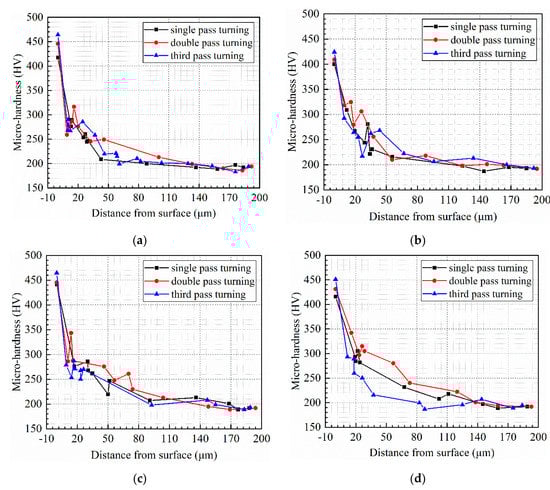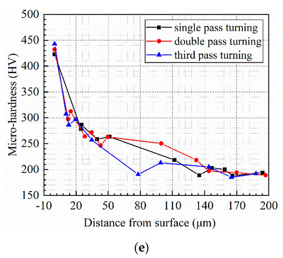 According to the micro-hardness measurement results, the micro-hardness was obtained at different depths under multi-pass turning conditions, as shown in Figure 9. Deformation caused by hard turning could affect the hardness of the surface and sub-surface layers. From Figure 9a–e, the surface micro-hardness increased by 6.9%, 2.3%, 0.9%, 3.6%, and 2.1% after double-pass turning compared with single-pass turning, correspondingly, and the surface micro-hardness improved by 4.0%, 3.7%, 4.5%, 4.6% and 2.5% after triple-pass turning compared with double-pass turning, respectively.