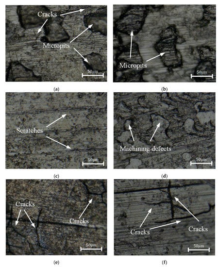 The cracks of the specimens immersed in boiling MgCl2 for 30 min are illustrated in Figure 10. The cracks were mainly perpendicular to the radial direction due to the high tensile stress in the radial direction. Fine cracks and micro-pits were distributed on the surface, as shown in Figure 10a. The appearance of micro-pits was the result of machining defects. Figure 10b–d demonstrate that no cracks were observed on the turned surface. Turning scratches and machining defects were detected, as shown in Figure 10c,d. As presented in Figure 10e,f, more cracks were found on the surfaces of triple-pass turning. Cracks were generated in part of single-pass turning samples, no crack initiated in double-pass turning, and a great number of cracks were produced in triple-pass turning.