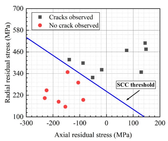 Obviously, the state of biaxial stresses caused by machining had a considerable effect on the initiation of SCC. Figure 11 shows the relationship between SCC initiation and biaxial residual stress distribution. The solid black squares signified that cracks were generated, while the red circles meant that no crack was initiated. From the figure, the area of SCC initiation was concentrated in the upper right of the coordinate system, while the area without cracks was concentrated in the lower left of the coordinate system. Cracks were found at the locations with larger residual stresses in both the axial and radial directions, indicating high SCC susceptibility in the region. Similar results were reported in a study of 316 stainless steel [44]. Rhouma et al. [45] indicated that a threshold straight line divides the biaxial stress coordinate system into a crack-presence region and a crack-free region. The threshold, which was less than 270 MPa, was the sum of the axial and radial stresses. Similar results were obtained in the current paper, and the threshold value was about 240 MPa for 304 austenitic stainless steel.
