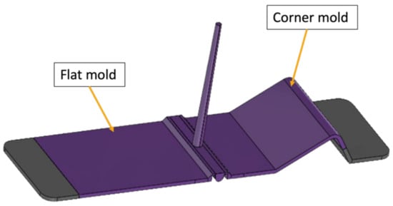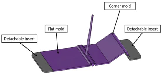 The mold was designed to enable the over-molding in three different cavities. A flat plate mold whose wall thickness can be adjusted to 2 or 3 mm and a corner-shaped mold with an inner radius of 4 mm and wall thickness of 3 mm as depicted in Figure 1.