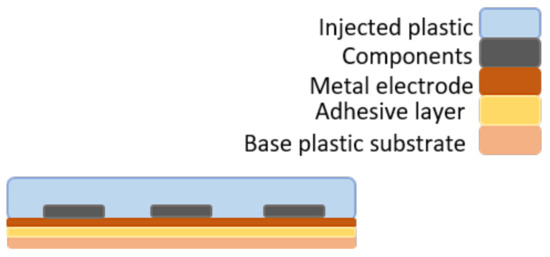 Plastic products are becoming very popular for mass production since they are cheap, versatile, and easy to manufacture in a variety of forms. Plastic products arefabricated using different manufacturing processes including, injection molding, thermoforming, blow molding, and extrusion. Since the 1990s, a special injection molding process based on insert film technology has gained great importance from researchers and manufacturers. This process is called the in-mold or over-molding process. It is based on a foil insert that could be an electrical foil with assembled components which is inserted into an injection mold that defines the shape of the part that is to be produced. An injection molding machine then rapidly injects the molten thermoplastic into the mold and then the temperature is controlled to quickly cool the produced part. A packing pressure is applied that pushes additional melt into the cavity during the initial stage of this cooling phase to compensate for the volumetric shrinkage of the solidifying melt. The in-mold process is greatly preferred in the automotive industry because it can offer lightweight plastic products with good mechanical strength together with functional circuits [1,2]. This elevates user expectations since this technology can generate three-dimensional structures. Therefore, it is sufficient that the electronic systems fit a convenient form factor of the shape into which they will be integrated. Many researchers worked intensively to integrate different electrical functionalities like light emitting diodes (LEDs), light guides, numerous touch switches or slides, and near field communication (NFC) antennas into plastic products using the in-mold process [3,4]. By fabricating optical touch panels, organic light emitting diodes (OLEDs), foils, and disposable healthcare sensors, T. Alajoki et al. [5] demonstrated the feasibility of hybrid in-mold integration. O. Rusanen et al. [6] developed the IMSE technology (injection-molded structural electronics) by integrating pre-formed silver-based printed electronics and standard electronics components into 3D plastics. Moreover, Juntunen et al. [7], and Kololuoma et al. [8] realized wearables. A novel concept that could serve as a platform for the integration of photovoltaic (PV) cells into plastic products was developed by M. Bakr et al. [9]. Moreover, adhesion mechanics and a demonstration of how to power LEDs wirelessly using an NFC antenna and a chip were discussed in [10]. Wimmer et al. [11] concluded that printed conductive structures must be optimized for the forming process to achieve and maintain the highest electrical conductivity possible. O. M. Tuomikoski et al. [12] demonstrated indoor air quality monitoring and red-green-blue (RGB) luminaire devices with both printed and injection-molded parts. In addition to this, some researchers have expressed interest in examining the impact of the process on different electronic packages, flexible foil materials, metallization, assembly methods, and mold shapes to determine the effect of plastic materials on microsystems [13,14,15,16,17].