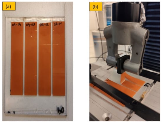 The molded foils were then laser cut into 15 mm wide foils strips as depicted in Figure 4a (n = 4) and peeled using an Instron 5500R (Illinois Tool Works Inc., Glenview, IL, US) tensile test machine with an attached peel-off fixture as shown in Figure 4b. A peel speed of 10 mm/min was chosen and static load cells were 10 N and 100 N used for PI and PET foils, respectively.