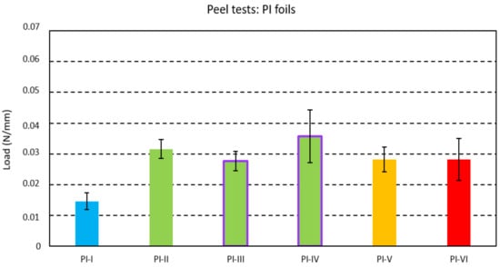 The mean peel strength was recorded for a peel length of 40 mm for each foil strip. The averaged peel strength per investigated foil with standard deviation indicating the variation between the foil strips is given in Figure 5 for PI foils with an acrylic adhesive layer and in Figure 6 for PET foils with polyurethane as an adhesive layer. The polyurethane-based adhesive in PET foils showed about 10 times larger adhesion with the injected PC compared to the acrylic-based layer in PI foils.