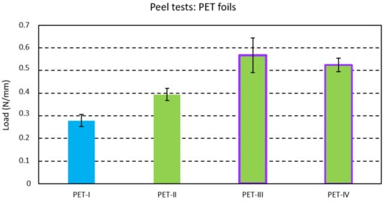 Likewise, One-Way ANOVAs with Tukey tests (with a 95% confidence interval) for PET foils were made. Increasing the mold temperature from 80 °C (PET-I) to 100 °C (PET-II) was again found to yield a significantly higher peel strength. A further increase could be noted when applying corona or oxygen plasma treatment to the polyurethane-based adhesive layer (PET-III and PET-IV).