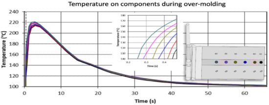 The temperature profile of the resistors during the injection molding cycle was numerically investigated using the commercial injection molding simulation software Autodesk Moldflow Insight (AMI) as depicted in Figure 7. An AMI model was created exemplarily for the 2 mm plate (3,141,193 elements), comprising the eighteen 1206 components (in total 77,748 elements) molded as solid aluminum oxide blocks. The two layers of the PI films were modeled separately as acrylic and polyimide parts (188,900 elements). Moreover, the mold (3,116,641 elements) with cooling channels was included too. Figure 7 shows the temperature development on the 1206 components during over-molding with the PC when a melt temperature of 300 °C, a mold temperature of 100 °C, and an injection speed of 70 cm3/s is used. The grey dashed line indicates the end of filling (~0.4 s) with the inset focusing on this stage of the injection molding cycle. The highest temperatures of approximately 215 °C are reached later during packing. The used temperatures are lower than the melting temperature of the soldering material which is 260 °C. Therefore, it can be assumed that the resistors will remain fully functional and reliable after over-molding.