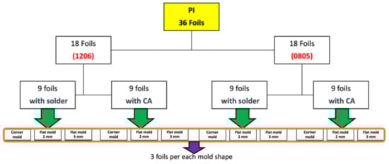 The mold is roughly 98.5 mm in length, and we ensured that components were assembled 22 mm away from the mold side wall. The assembly step involves mounting SMD resistors (zero-ohm resistors) acquired from Yageo to the PI-Cu and PET-Cu foils. The assembly plan for the PI-Cu foils included 18 foils assembled using a standard lead-free solder paste [30] and 18 foils assembled using thermoset silver-based conductive glue (Henkel CE 3103) [31]. Lead-free solder and conductive glue were applied to the copper pads of the copper traces, followed by the resistor assembly. Following that, the foils are heated until the solder particles reflow and harden in a reflow oven. On the other hand, in the case of conductive glue, it is cured for 20 min at 120 °C in a convection oven. Figure 8 depicts the used foils assembly plan for the PI-Cu foils and Figure 9 shows a real-life image of a foil with assembled components.