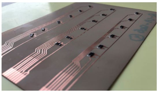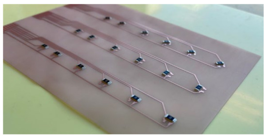 Moreover, the assembly plan for the PET-Cu foils included 9 foils assembled using a low-temperature melt solder paste (Interflux DP5600, Interflux Electronics, Gent, Belgium) [32] and 9 foils assembled using thermoset silver-based conductive glue (Henkel CE 3103). The same steps were taken for the PI-Cu foils. The only difference is the use of the reflow oven for the low-melt solder paste and low-melting temperature PET foils. The reflow oven was configured for preheating for 5 min at 160 °C, followed by 15 min of reflow at the same temperature at 160 °C, then cooling for 6 min. Figure 10 depicts the used foils assembly plan for the PET-Cu foils and Figure 11 shows a real-life image of a foil with assembled components.