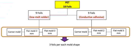 Assembly using lead-free solder proved its applicability when using PA6 as the injected molding material and PI-Cu foils as presented in our previous work in [10]. However, in this paper, assembly using low-temperature solder and conductive adhesive is also studied. Moreover, different foils, PET-Cu-based foils are evaluated to broaden the research area on the influence of over-molding parameters on electrical characterization. The following sections are divided into two main subsections, PI-Cu foils and PET-Cu foils including a detailed explanation of the measurements.