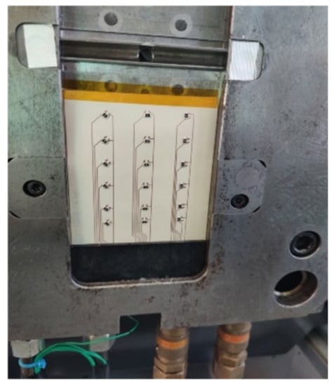 The most critical factor in over-molding technology is the compatibility of the various materials to achieve sufficient adhesion between the insert foil and the polymer injected by the injection molding machine. Many research studies were conducted to determine the impact of material combination and injection molding processing parameters on the interface adhesion, which, in turn, determines the product’s properties. These experiments did not include any electronics, instead, only foils were over-molded with the injected polymer. Yamaguchi, S. [18] studied the influence of crystallization on the adhesion of polypropylene (PP) foil to PP-injected polymer at the interface. Additionally, Chen et al. examined the characterization of temperature profiles while using PET and PC foils with PC [19] and PP [20] as an injected polymer, observing that both combinations yielded satisfactory results. Moreover, other studies have defined fundamental concepts of interface adhesion using one or more of the following surface treatment mechanisms: interface interlocking, molecular diffusion and entanglement, crystallization, and adsorption theory [21,22,23,24]. However, surface treatments are not suggested for large-scale production because they increase the overall cost.