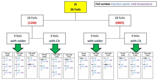 Figure 14 lists the 36 produced over-molded PI-Cu foils with their corresponding settings. Those foils yielded a broad molding window in which (visually) undamaged parts could be produced. The aim was to find those boundaries of the injection molding process by changing the melt temperature between 240, 260, 280, and 300 °C and the injection speed to either 20 or 70 cm3/s. In preceding tests with the PET foils (without components) it was shown that they were significantly more sensitive to the formation of wrinkles during over-molding. This issue could be reduced when selecting a higher melt temperature and faster injection speed setting of 300 °C and 70 cm3/s, respectively.