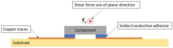 Table 3 displays the shear load at the break for the investigated 0805 and 1206 components assembled using solder, low-melt solder, and conductive adhesive on PI and PET foils. As a general observation, the load at break increased by increasing the component size. Moreover, higher shear loads at break were recorded when the components were soldered not glued using the conductive adhesive.