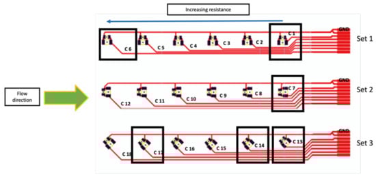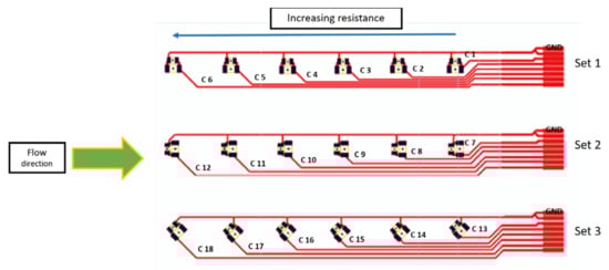 To compare Rmeasured and Rtheoretical we had to consider Rinitial = 0.2 Ω, the ρ of copper = 1.7 × 10−8 mΩ, the track thickness = 35 µm, and the track width = 300 µm. We calculated R theoretical for 18 resistors using Equation (1), and Table 5 presents the data for set 1 of the resistors. No significant difference in resistance was found between the measured and calculated values. Moreover, this comparison demonstrates that the primary contributor to the measured resistance is the change in resistance of the copper track length; both solder connections and probe contacts contribute insignificantly to the measured resistance.