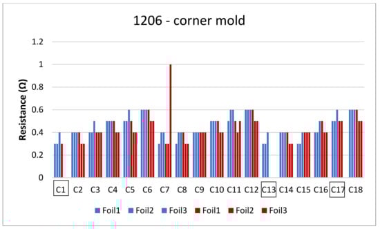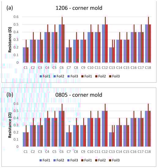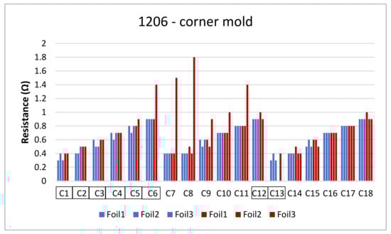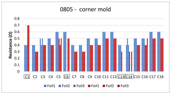 In the literature, low-temperature solder was the material used to assemble the electrical components on PET foils [33,34,35]. However, we considered using conductive adhesive since it also cures in low-temperature conditions at 120 °C and the degradation process of PET at such temperature is relatively slow [36]. Figure 42 depicts the resistance values in the corner mold. The change in resistance measurements was taken before (blue bars) and after (red bars) over-molding. All foils were over-molded using a high melt temperature of 300 °C. It was observed that these foils had many components that were detached after over-molding.