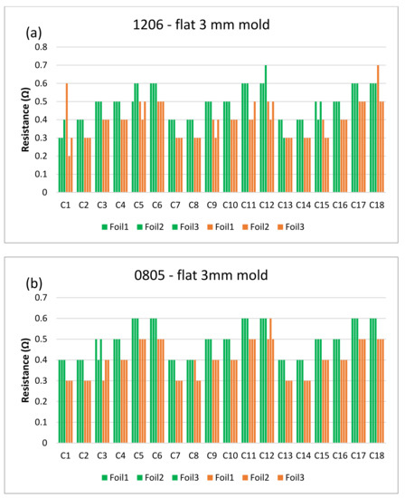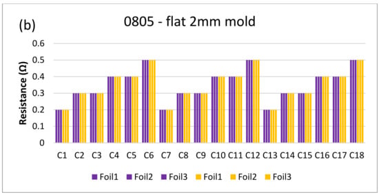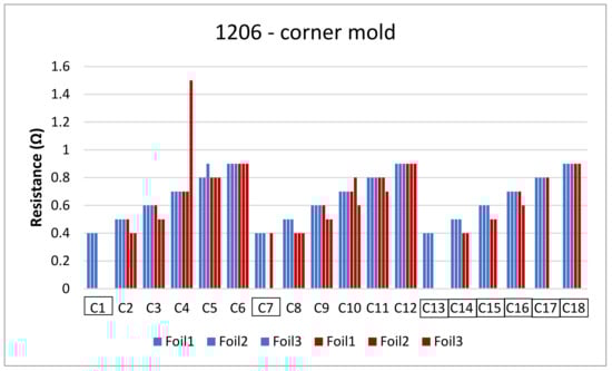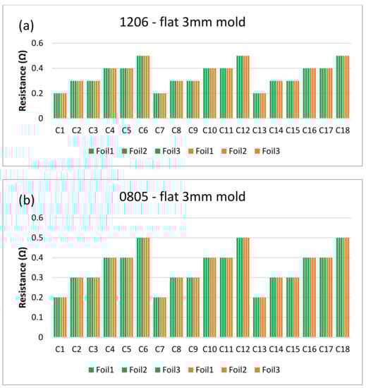 Figure 18 and Figure 19 show the measurements for the three foils in the flat mold in 2-mm and 3-mm cavities, respectively. The over-molding did not affect the measured resistance, indicating that solder-based components can withstand the over-molding process and also that the internal stresses in the flat molds are lower than in the corner mold.