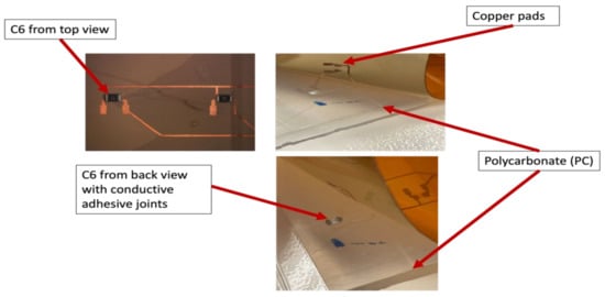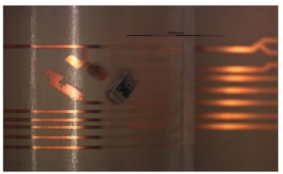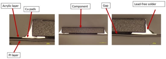Moreover, a visual examination was conducted to verify that the solder connections between the components and the copper pad were intact. The cross-section images were obtained in two-component positions: on a flat surface and on a curved slightly formed surface. Figure 20 illustrates a component constructed on a flat surface, whereas Figure 21 depicts a component assembled on a curved surface.