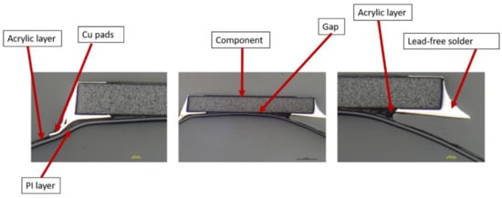Cross-section images of both positions, curved and flat surfaces, demonstrate the strong connection formed by assembled components and copper tracks when lead-free solder is used. Even in the case when the component is near the curvature’s location, the solder is attached to the acrylic adhesive layer. These images demonstrate our work’s novelty on why solder joints are preferred in the over-molding process when using acrylic-based flexible foils. Additionally, it may be used in curvatures with a small radius, such as the 4 mm in our case.