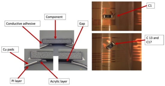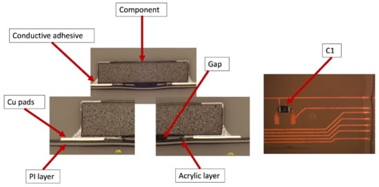 Foils tested were assembled using 0805 and 1206 SMD 0-ohm resistors. These resistors were selected in our study because they can be easily assembled manually in a reproducible way. To know the actual resistance of the resistors, we used a multimeter to check the value of ten 0 Ω resistors from both packages to act as the Rinitial of the component, which was 0.2 Ω before assembling the resistors on the foil. Each 0 Ω resistor mounted on the flex has a different track length (L) between the component and the connection pad as depicted in Figure 16.