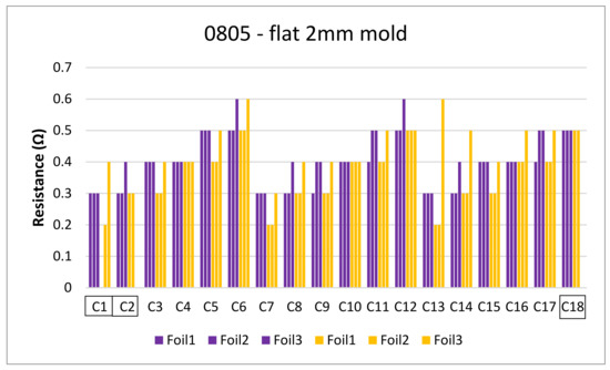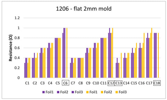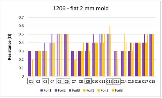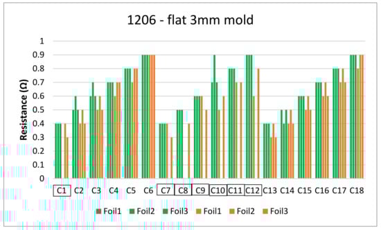 Measurements were made in a flat mold with a thickness of 3 mm, as shown in Figure 47, where green bars denote testing before over-molding and orange bars denote measurements after over-molding. The resistivity of the majority of components had changed because of the break in the ground track in foil 2, which led to non-conducting components between C7–C12. Moreover, foil 1 had a detached component (C1).
