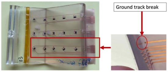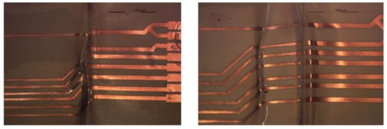 Additionally, as indicated before in Section 2.3, the detachable inserts were added to protect the contacts and to facilitate the resistance measurements after over-molding. However, the films occasionally developed wrinkles as a result of over-molding during the transition to the insert and some of the foils had compressed copper tracks, as illustrated in Figure 33. This wrinkling effect caused a discontinuity in the copper tracks and, therefore, some components also had very high resistance as in the case of components C2 and C18.