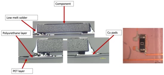 Moreover, some components remained on the foil after over-molding but had high resistance measurements as was the case for C13. In this case, cross-sectional images were taken to assess the connection reliability between copper pads and low-melt solder joints, as depicted in Figure 40. This image shows a discontinuity in the copper and the PU layer.