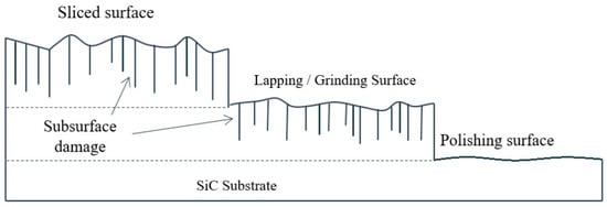 Illustrations of surface roughness and subsurface damage depth at the slicing, lapping, grinding and CMP steps of the SiC wafer production process [3].