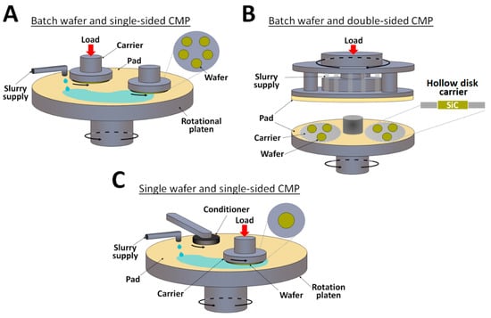 Different configurations of SiC CMP, including (A) batch wafer and single-sided CMP, (B) batch water and double-sided CMP and (C) single wafer and single-sided CMP. (Ref. CMC Materials Co.).