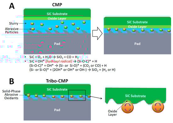 (A) Illustration of CMP mechanism. The oxidants in the slurry oxidize the SiC surface into a softer oxide layer which can be removed by the abrasive particles in the slurry and the conditioned CMP pad simultaneously. The chemical reactions of SiC oxidation, which are initiated by either oxygens or hydroxyl radicals, are shown [7,8]. Note that asterisk represents radicals. (B) Illustration of Tribo-CMP mechanism. In addition to the global oxidation taking place at the slurry and SiC interface, localized oxidation can also occur when the solid-phase abrasive oxidants roll on the SiC wafer surface.