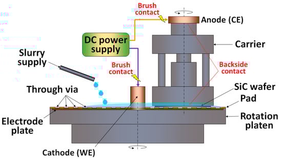 The electro-CMP (ECMP) process has been widely investigated for the CMP of metal layers, such as Cu, W and Al, for many years [24]. For the SiC ECMP, the anodic oxidation can convert the hard SiC surface into a softer oxide layer, so that the abrasives composed of CeO2 or SiO2 can efficiently remove the oxide layer. In a typical ECMP setup (Figure 4), a working electrode (WE) is connected to a copper plate which has direct contact with the SiC wafer. A counter electrode (CE) is connected to the slip ring of the spindle and a reference electrode (RE) is connected to an Ag/AgCl plate. Since the ECMP relies on the wafer conductivity, N-type SiC wafers with low resistivity (~10−3 Ω·cm) are usually preferable to semi-insulating SiC wafers with high resistivity (~106 Ω·cm).