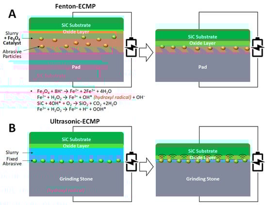 (A) Illustration of Fenton-ECMP mechanism. The oxidants and Fe3O4 catalyst in the slurry oxidize the SiC surface into a softer oxide layer which can be removed by the abrasive particles in the slurry and the conditioned CMP pad simultaneously. Under acidic conditions, Fe3O4 generates Fe2+ which undergoes a Fenton reaction with H2O2 to generate strong oxidant hydroxyl radical, denoted as OH* [27]. The oxide layer is removed by the abrasive particles in the slurry and the conditioned CMP pad simultaneously. (B) Illustration of ultrasonic-ECMP mechanism. After the anodic oxidation of SiC, the oxide layer is removed by a vibrating grinding stone with fixed abrasives.
