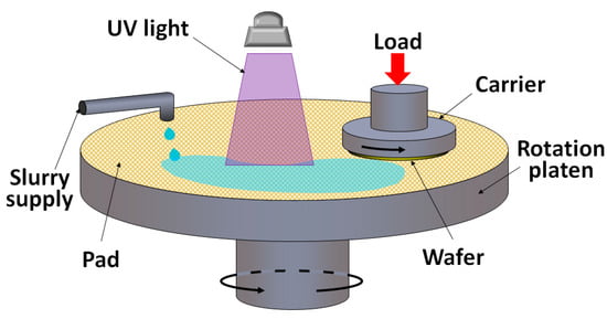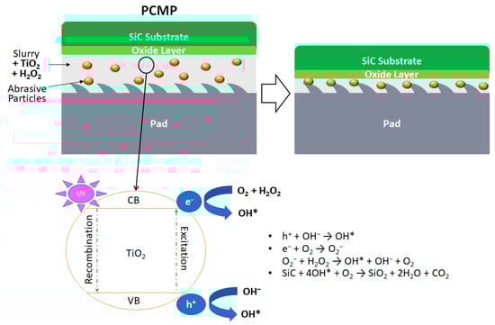 Photocatalyzed-CMP (PCMP) adds an additional oxidation source by applying UV light to highly photocatalytic particles, such as TiO2. The hydroxyl radicals generated by the photocatalytic process enhance the oxidation efficiency as well as the MRR (Figure 6 and Figure 7). In 2018, Yuan et al. proposed that photocatalysts, UV light, electron capturers and an acidic environment are the key factors in PCMP [31]. The MRR and surface roughness (Ra) equal to 0.96 µm h−1 and 1.95 nm, respectively, on the 4H-SiC surface, can be obtained by using synthetic fibrous polymer pads and applying UV light on the slurry consisting of TiO2 and H2O2 at pH = 2, polishing pressure = 0.025 MPa and rotation speed = 60 rpm. Compared to the control groups using TiO2 + H2O2 + pH 2 and TiO2 + UV + pH 2, the experimental group using TiO2 + UV + H2O2 + pH 2 yields the best polishing result [31]. In 2021, Wang et al. introduced a sulfate radical-based advanced oxidation process which applies sulfate (K2S2O8) into the PCMP system (sulfate-PCMP) [32]. Similar to the functionality of H2O2, the sulfate tends to generate SO4− radicals during the PCMP process. Under the conditions of 3 wt% sulfate, 0.02 wt% TiO2 and pH 6 in the slurry, the highest MRR can be obtained [32].