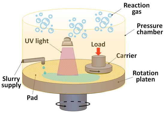 In 2021, Yin et al. developed a new PCMP method, in which the PCMP was conducted in an enclosed chamber filled with different compositions of gases, such as air, O2 and N2 (gas-PCMP, Figure 8) [34]. The highest MRR and dissolved oxygen (DO) amount were obtained on both Si-face surface (MRR = 43 nm h−1 and DO = 57 mg L−1) and C-face surface (MRR =108 nm h−1 and DO = 57 mg L−1) with the oxygen partial pressure equal to 300 kPa. By adding 0.3 wt% TiO2 particles and UV illumination into the system, the MRR can be increased by 30% and 10% on the Si-face and C-face surfaces, respectively. The MRR on the Si-face surface was about 2.2-fold higher than open air CMP [34]. In 2021, Lu et al. proposed a UV-photocatalyzed-Fenton combined mechanism for CMP, aiming at increasing the hydroxyl concentration as well as the MRR (Fenton-PCMP) [35]. Under the conditions of polishing pressure = 0.04 MPa, rotation speed = 60 rpm, slurry flow rate = 33 mL min−1 and using a polyurethane pad, the highest MRR of 387.2 nm h−1 on the C-face surface was obtained from the UV + TiO2 (4 g L−1) + Fenton group. The phenomenon that UV illumination could lead to better surface roughness was observed not only for the UV + TiO2 (4 g L−1) + H2O2 (5 wt%) group and UV + TiO2 (4 g L−1) + Fenton group, but also for the UV + H2O2 (5 wt%) group and UV + Fenton group. Moreover, the MRR holds a negative relationship with the surface roughness in the UV-illuminated groups [35].