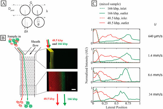 - Huang, L.R.; Tegenfeldt, J.O.; Kraeft, J.J.; Sturm, J.C.; Austin, R.H.; Cox, E.C. A DNA prism for high-speed continuous fractionation of large DNA molecules. Nat. Biotechnol. 2002, 20, 1048–1051. [Google Scholar] [CrossRef]
