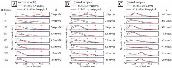 Separation of long DNA (48.5 kbp) from short DNA (0.25 kbp to 10 kbp) as a function of three long DNA concentrations. The short DNA concentration was set constant at 100 µg/mL while the long DNA concentrations were (A–C) 3.7 µg/mL (dilute, C/C* ≈ 0.070), 117 µg/mL and 230 µg/mL (C/C* of approximately 2.6 and 4.1, respectively, both semidilute). Images were collected simultaneously in two colours. The curves have been normalized so that the areas of the distributions are the same across each panel. Note that the salt concentrations differ slightly between the three samples. However, these differences become insignificant as the buffer in the sheath flow is of the same salt concentration between the runs, see Table S2 of the Supplementary Materials. A video showing the raw data for the lowest and the highest applied pressures, for the two DNA components and for the three different concentrations of the λ phage DNA can be found in the Supplementary Materials, see Video S2.