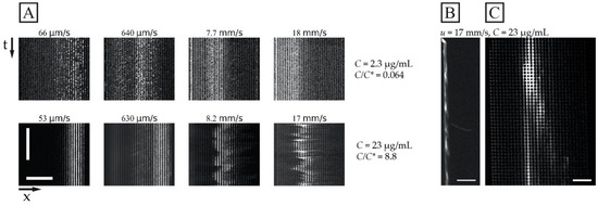While Figure 3 shows the average outlet distributions, Figure 4 illustrates the detailed behaviour of the flow of the DNA samples in one experiment for the long DNA, T4 phage DNA (166 kbp), at the higher concentration (23 µg/mL, C/C* >> 1, in a 0.26× TE buffer) compared to the lower concentration (2.3 µg/mL, C/C* << 1, in a 4.9× TE buffer). Here, the different buffers are used to enhance the difference in C/C*. Two important observations can be made regarding the behaviour of the higher concentration. Firstly, the overall displacement is larger across the range of flow velocities tested (Figure 4A bottom row) and the sample stream is more focused. Secondly, at sufficiently high flow velocities mm/s), we observe instabilities in the stream of the displaced DNA. These instabilities take the form of variations in the lateral position of the sample stream over time, see Figure 4A, and in the concentration of the DNA along the length of the displaced sample stream, see Figure 4B,C and Video S3 of the Supplementary Materials. Note that, despite these variations, we can still obtain a significant displacement of the sample that can be leveraged for separation.