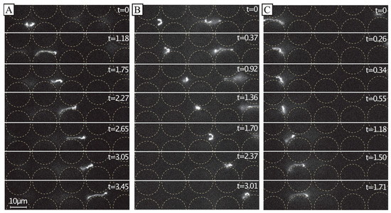 Dynamics of dilute 166 kbp long DNA strands (C = 0.01 µg/mL, 5× TE buffer). We show motion of three individual molecules at the end of the device and laterally displaced (A–C) u ≈ 21 µm/s (De = ). The images show the evolution of the shape of the molecules at different time scales. The frames are sequential but with different temporal gaps. The exposure time was 19.3 ms. The videographs corresponding to the panels can be found in the Supplementary Materials, see Video S4. Flow is left to right. Time stamp unit is seconds. Scale bar is 10 µm.