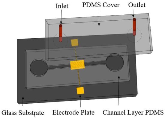 The microfluidic impedance detection chip designed in this paper was divided into three layers: the substrate layer, the channel layer, and the cover layer, as shown in Figure 1.