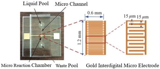 The design of the gold (Au) interdigitated microelectrodes is shown in Figure 2. The following are the design parameters: 20 pairs of gold (Au) finger microelectrodes with an electrode thickness of 100 nm, a length of 0.6 mm, a width of 15 μm, and an electrode spacing of 15 μm. The microchannel’s dimensions were 7 mm in length, 0.5 mm in width, and 100 μm in depth; the parameters of the liquid storage pool and waste liquid pool were as follows: diameter of 3 mm and a depth of 100 μm; the volume of the microreactor was 1.2 mm × 0.5 mm × 0.1 mm = 0.06 mL. A 0.5 mm diameter hole was punched in the center of the cover layer corresponding to the liquid storage pool and the waste liquid pool. The connecting pipe was used for the input and output of the reagent.