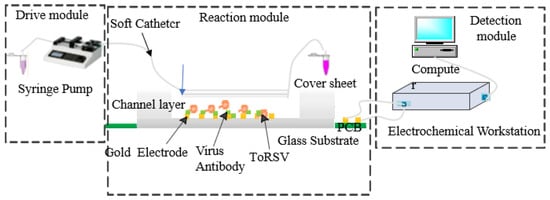 Figure 3 depicts the schematic diagram of the microfluidic chip impedance detection system, which consists primarily of the driving, reaction, and detection modules. The drive module for the microinjection pump (Model Harvard, Harvard Apparatus, Holliston, MA, USA). The injection pump connects to the entrance of the microfluidic chip through a soft catheter and a steel needle of 0.5 mm in diameter, in order to inject the virus detection sample and related reagents into the microfluidic chip at the prescribed rate. The reaction module consists of a microfluidic chip and a gold interdigital electrode that serve as a reaction platform for the development of phenomena in the sample capture and immune reaction processes, as well as the generation of impedance change signals. An electrochemical workstation (Model CS350, Wuhan Coster Technology Co., Ltd., Wuhan, China) and a computer make up the detection module. The gold fork micro-electrode of the microfluidic chip is linked to the electrochemical workstation, and the impedance change signal created on the gold fork micro electrode is detected, and the data are evaluated by the computer’s accompanying software.