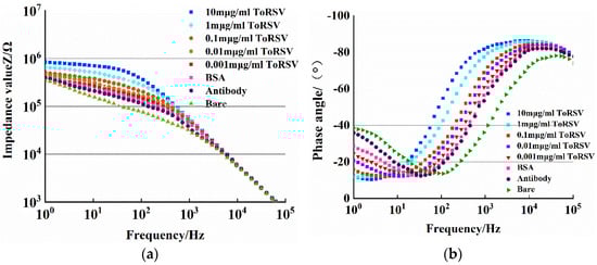 Figure 4a shows the impedance values of the bare electrode, antibody fixation, BSA closed electrode, and different concentrations of virus were evaluated in the range of 1~105 kHz. Because of the influence of the detecting frequency on the impedance, the impedance–frequency trend is as follows: In the high frequency range of 1~100 kHz, the impedance value increases linearly with the decrease in the frequency, and the magnitude of the impedance value recorded at each step is not obviously different; in the low frequency range of 1~1000 Hz, the impedance tends to be stable with the frequency decreasing. In addition, compared with the bare electrode, the electrode impedance was further increased after single PBS buffer solution, antibody fixation, and BSA sealed electrode, demonstrating that the antibody was successfully fixed on the electrode surface. The electrode impedance value grows as the antibody collects ToRSV and reacts, and the higher the ToRSV concentration, the greater the increase in resistance. The reason for the increase in impedance value is that the antibody on the electrode surface binds to the virus antigen, which leads to the obstruction of ion flow and electron transfer between the electrodes, and the virus concentration is proportional to the obstruction ability. The higher the virus concentration, the greater the degree of obstruction to ion flow and electron transfer ability, resulting in increased electrode impedance.