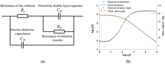 Equivalent circuit and simulation result. (a) Diagram of equivalent circuit. (b) Fitted curves of impedance and phase angle of 10 μg·mL−1 ToRSV.