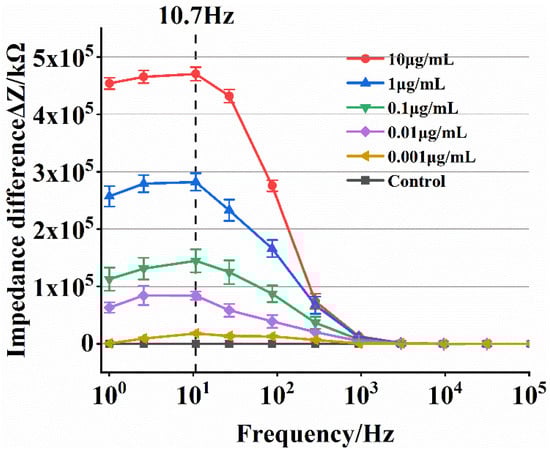 The mean impedance difference curve for various ToRSV concentrations is shown in Figure 6. The mean impedance difference value can be calculated by subtracting the impedance values measured by the negative control group from the impedance values of three repeated ToRSV tests, and the standard error of the mean impedance difference is described by the error bars. The change in average impedance difference has the same trend: In the low frequency region (1~1 kHz), the average impedance difference increases first and then decreases. The maximum average impedance difference is at 10.7 Hz frequency, and the average impedance difference between adjacent concentrations is the largest at this frequency. In the high frequency region (1~100 kHz), the average impedance difference almost coincides with 0. This demonstrates that the detection frequency of 10.7 Hz is optimal for the microfluidic impedance sensor developed in this research.