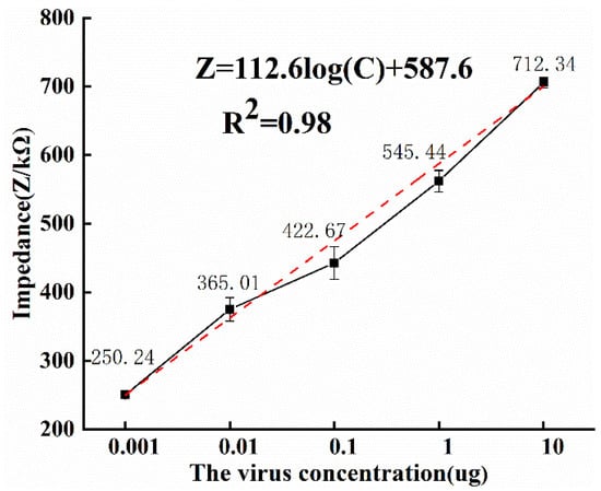 The black lines in Figure 7 indicate the relationship curves of the average impedance response values for five different concentrations of ToRSV, and it can be obtained that the magnitude of the average impedance value increases with the increase in ToRSV concentration. The red dashed line in Figure 7 indicates the linear regression equation after linear fitting, and the correlation coefficient of the linear equation is 0.98, which shows a good linear law. Taking the average impedance value as the experimental value Z, the virus concentration C and the impedance value Z can be expressed as.