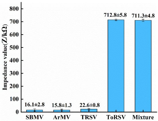 Figure 8 displays the impedance differences of the various viruses, including the impedance differences of the mixed four viruses. The impedance difference between the ToRSV solution and the mixture of four viruses is comparable. The impedance values of SBMV solution, ArMV solution and TRSV solution with the same concentration were close to those of the control group, which were greatly different from those of ToRSV solution. The experimental results show that the microfluidic impedance sensor designed in this paper for ToRSV detection has antibodies on the surface of the microfork finger electrode that react specifically only with ToRSV, and can recognize ToRSV from ToRSV single solution and various mixed solutions containing ToRSV, while it is ineffective in detecting other viruses. Therefore, it is demonstrated that the sensor has good specificity and effectiveness for ToRSV detection.