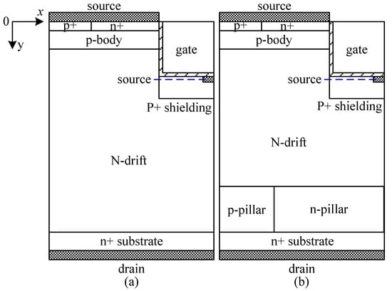 Since the silicon carbide trench-gate metal oxide semiconductor field effect transistor (UMOSFET) was first reported in 1994 [1], researchers have paid significant attention to it due to the excellent material properties of SiC, including a higher critical electric field, a wider band gap and a higher electron saturation drift velocity, compared to silicon [2,3]. However, this reported structure has a serious problem because it cannot reflect the advantage of the silicon carbide material in the withstand voltage, owing to a high electric field existing in the corner of the trench gate oxide [4,5]. In order to overcome this problem, B. J. Baliga proposed a novel UMOSFET incorporated with a P+ shielding region at the bottom of the trench gate [6], which is used to protect the gate oxide from a high electric field. However, at the same time, this also increases the specific on-resistance and power loss of the device by introducing a parasitic JFET region, composed of the p-body, n-drift and P+ shielding region.