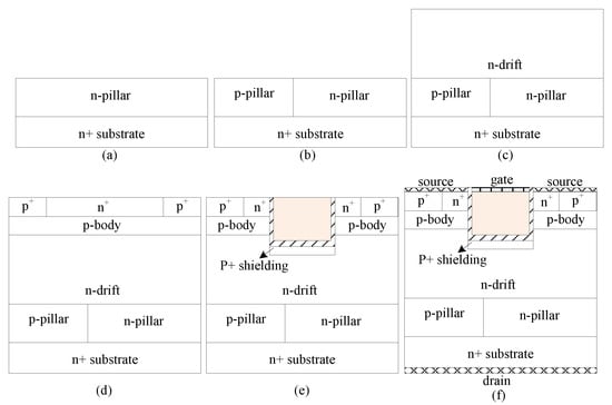 A possible fabrication process for BSJ-UMOS is shown in Figure 2. The key fabrication steps are as follows: (a) forming the n-pillar layer on the n+ wafer by epitaxial growth technology; (b) forming the p-pillar layer by ion implantation; (c) growing the n-drift layer by epitaxial growth technology; (d) forming the p-body layer by epitaxial growth technology and growing the P+ contact region and n+ source region by ion implantation; (e) forming the trench gate structure with the mature silicon carbide fabrication process; (f) metalizing all contacts and forming the gate, source, and drain electrodes. Compared with C-UMOS, such fabrication of BSJ-UMOS would be more complex, as it requires two extra process steps—growing the epitaxial n-pillar layer on the n+ substrate and forming the p-pillar layer via ion implantation.
