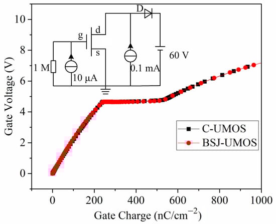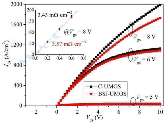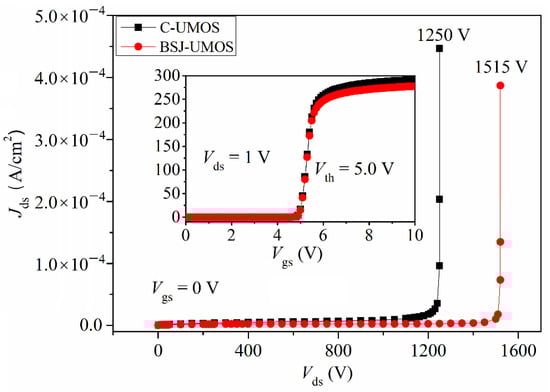 The transfer characteristic at Vds = 1.0 V for BSJ-UMOS and C-UMOS is presented in the inset of Figure 5. Obviously, the two structures have the same threshold voltage, about 5.0 V. Moreover, it can be seen that BSJ-UMOS has a weak current drive capability because of the introduction of the p-pillar region, which narrows down the current flow path.